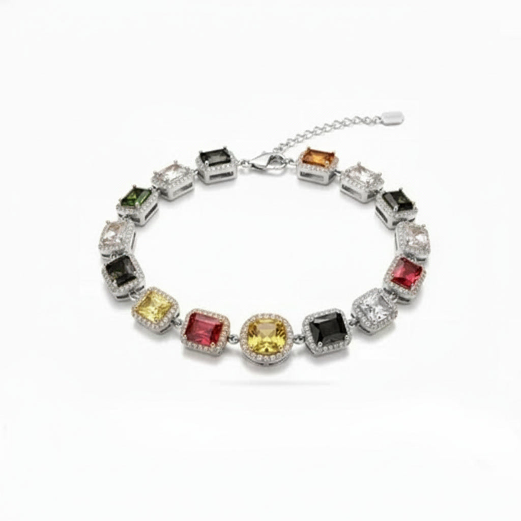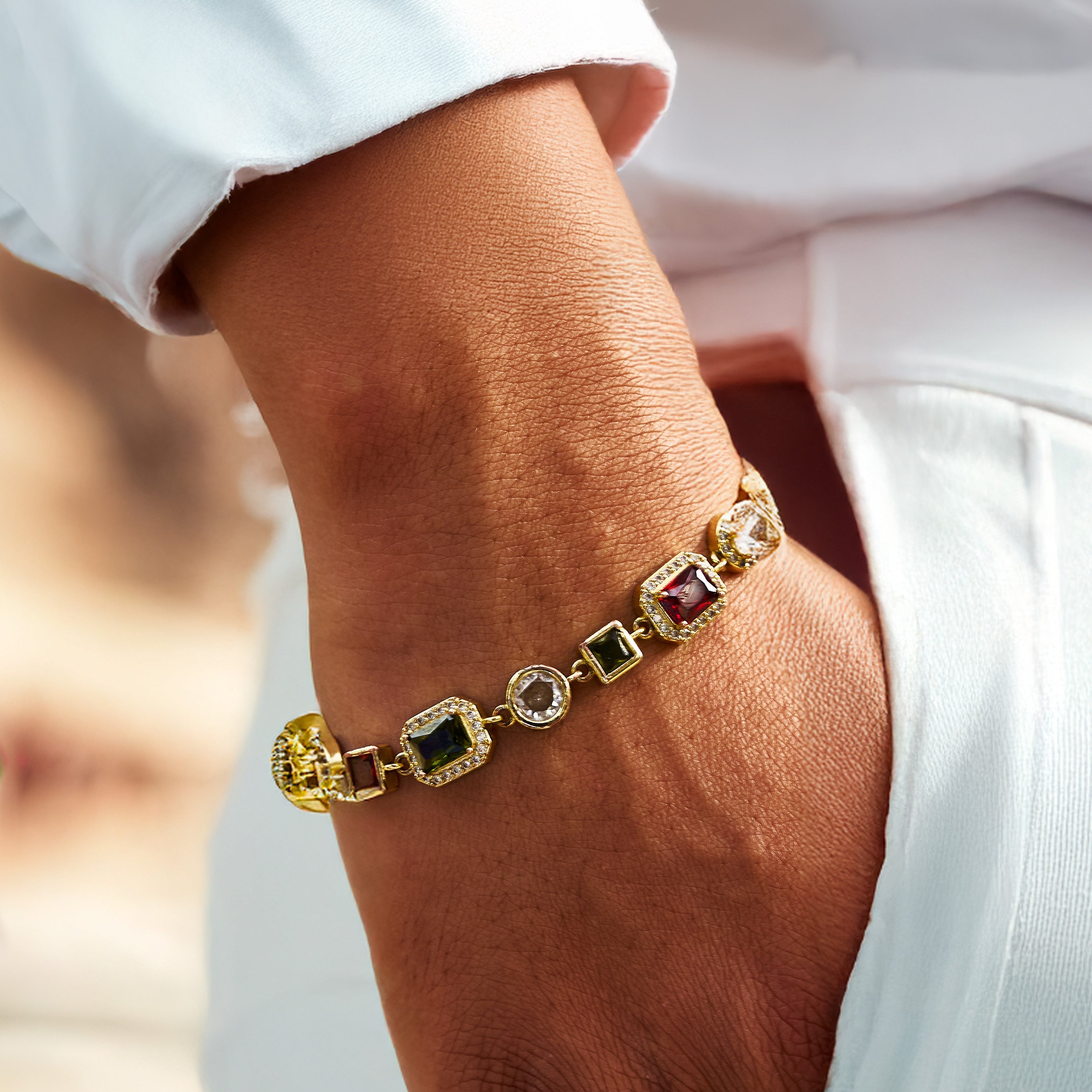The bracelet features multicolor gemstones in red, green, and yellow, colors traditionally associated with royalty and chosen for their strength, contrast, and character.