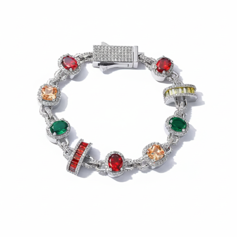 The bracelet features multicolor gemstones in red, green, and yellow, colors traditionally associated with royalty and chosen for their strength, contrast, and character.