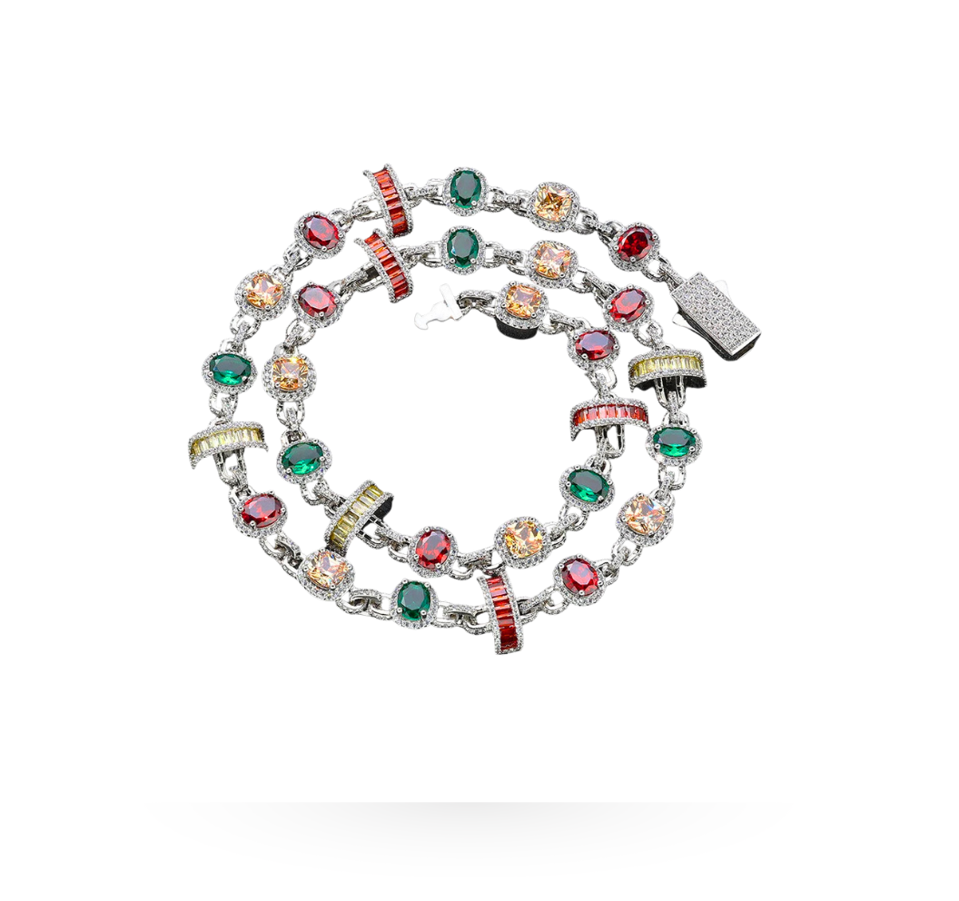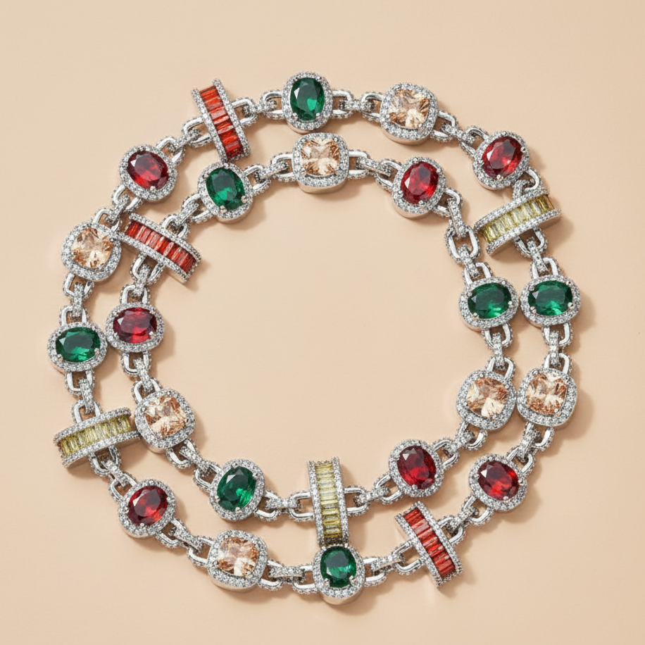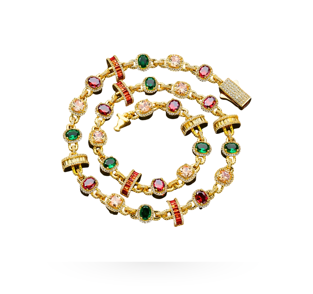The necklace features multicolor gemstones in red, green, and yellow, colors traditionally associated with royalty and chosen for their strength, contrast, and character.