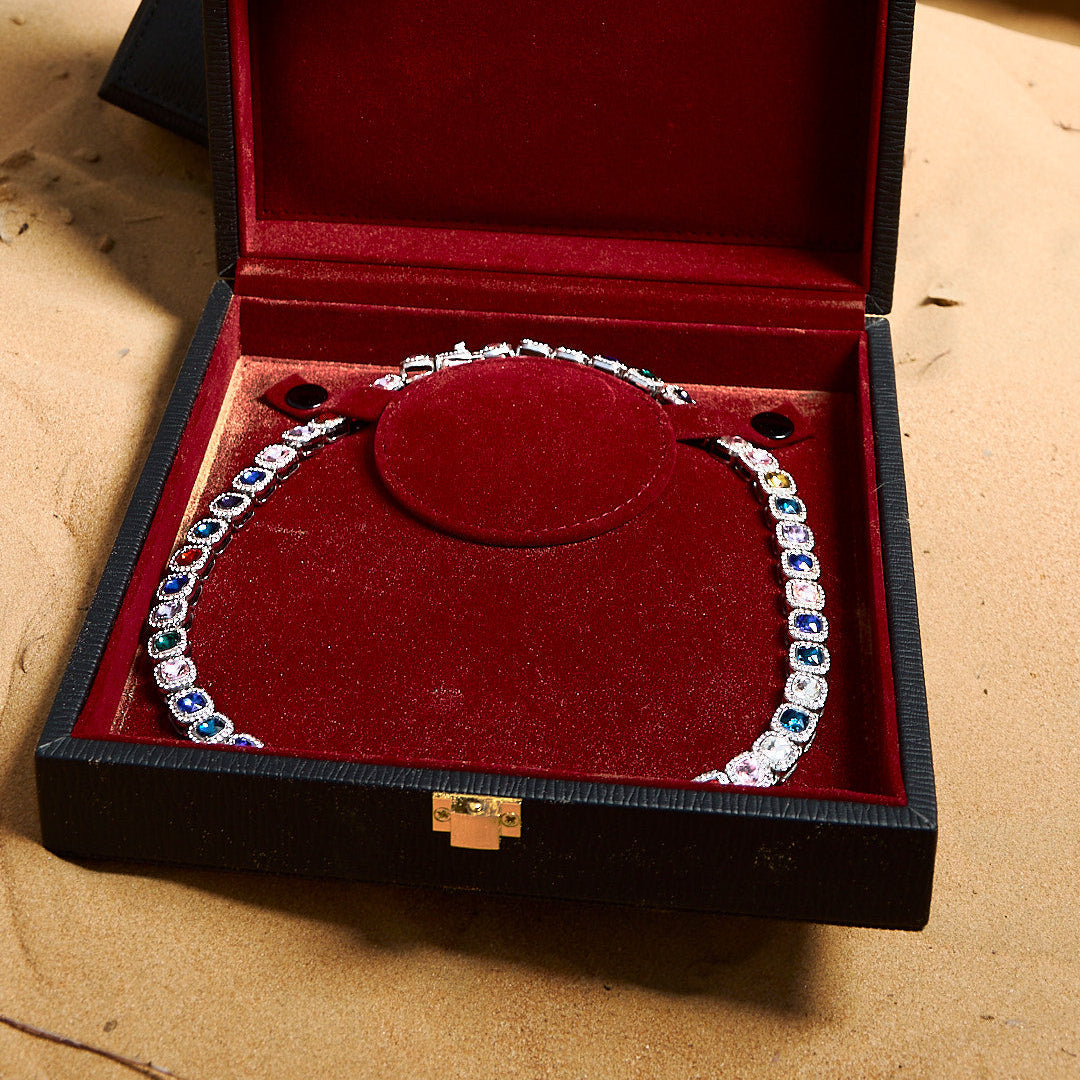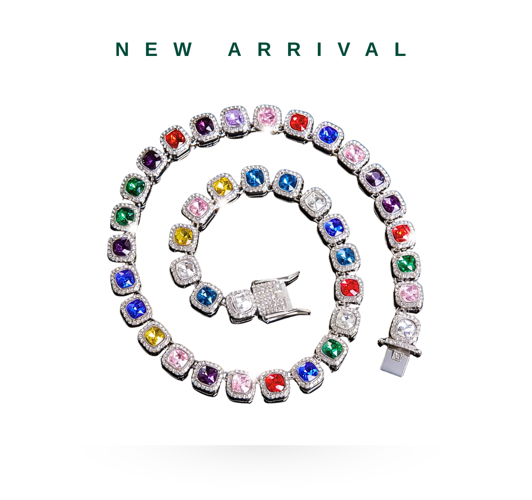 Crafted from high-quality copper and finished in silver plating, this unisex necklace fuses bold geometric design with a rainbow of premium cubic zirconia stones. A statement piece designed to elevate any outfit.