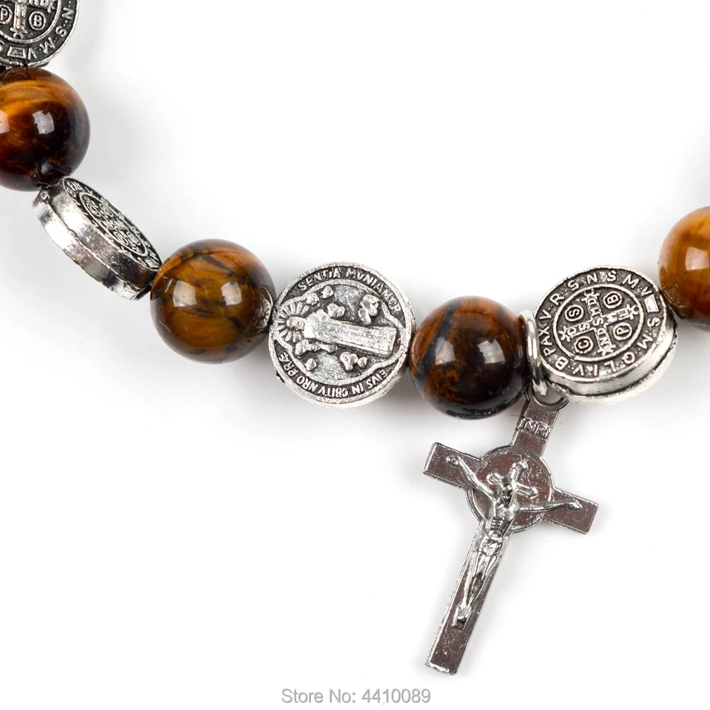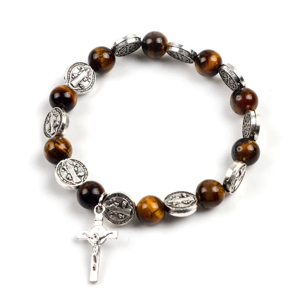 Tiger eye stone is traditionally valued for its grounding properties and striking golden-brown bands that catch the light beautifully. The St. Benedict medal serves as a symbol of protection and faith, making this bracelet a thoughtful choice for daily wear or as a meaningful gift. Weighing just 22g, it's comfortable enough for all-day wear while maintaining a substantial, quality feel. Whether you're drawn to its natural elegance or its spiritual significance, this bracelet brings together craftsmanship and purpose in one versatile piece.